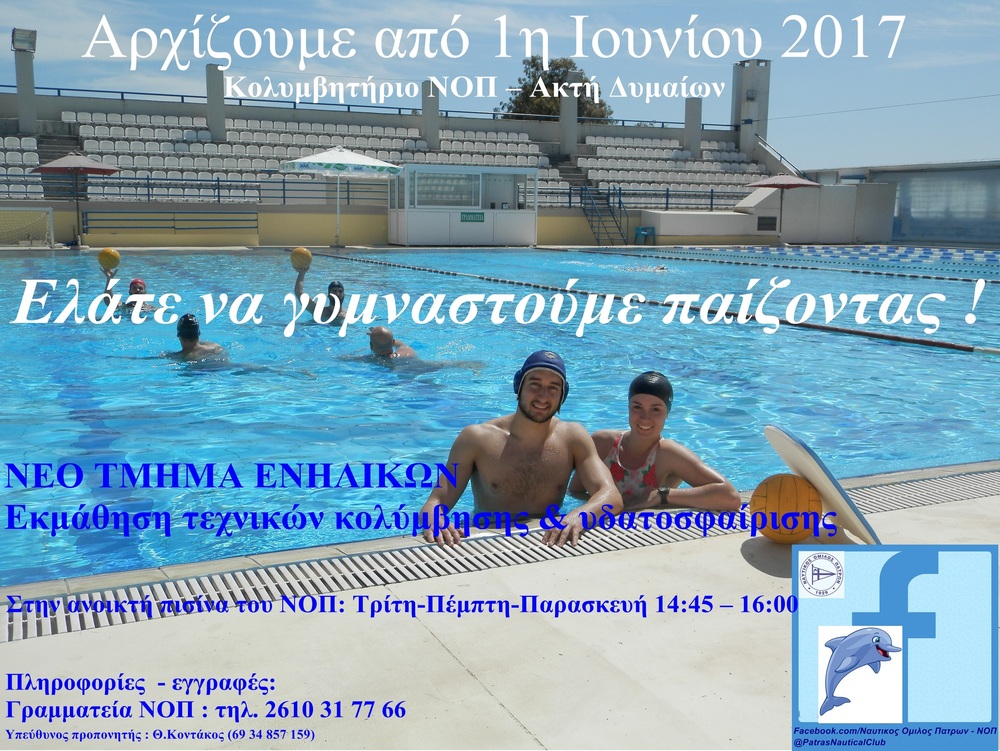 Από την Πέμπτη 1η Ιουνίου ξεκινά στην ανοικτή πισίνα του ΝΟΠ ένα νέο τμήμα κοινού που θα ήθελαν να γυμναστούν κολυμπώντας και παίζοντας πόλο. Απευθύνεται σε ενήλικες ή παλιούς αθλητές που θα ήθελαν να κολυμπήσουν ομαδικά και να παίξουν πόλο κάτω από την καθοδήγηση του προπονητή του ΝΟΠ Θανάση Κοντάκου.