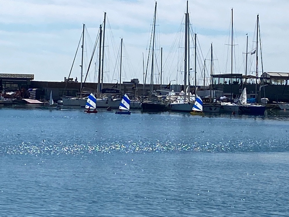 Ο μικρός ιστορικός λιμένας με πολλά αραγμένα πλοία και ανάμεσά τους διακρίνονται δεκάδες παιδιά με σκάφη όπτιμιστ, SUP, κανό και κωπηλατικά, να προπονούνται κάτω από την επίβλεψη των προπονητών τους, πάνω σε φουσκωτά σκάφη συνοδείας.