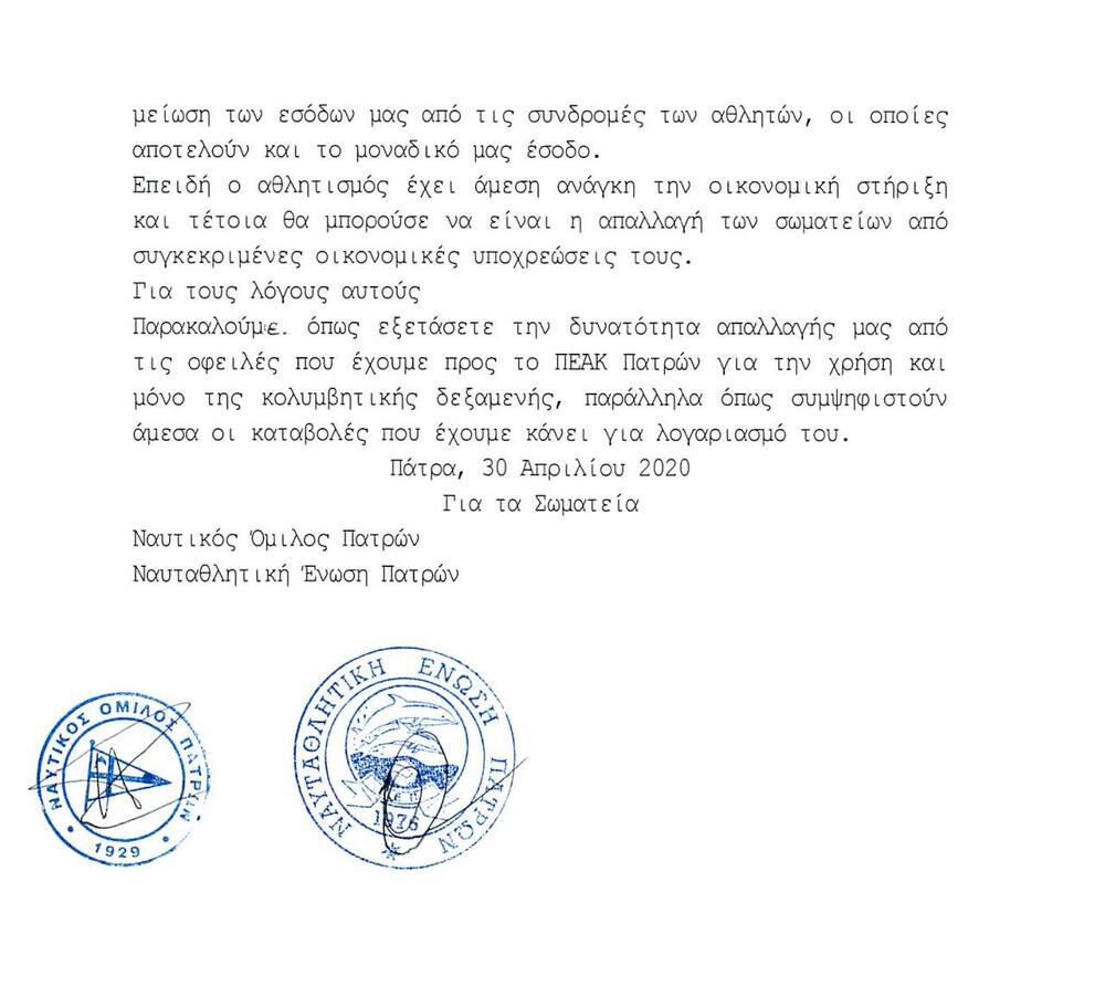 Σας επισυνάπτουμε επιστολή με την κοινή θέση των σωματείων του Ναυτικού Ομίλου Πατρών & Ναυταθλητικής 'Ένωσης Πατρών σχετικά με το θέμα που έχει προκύψει από την απαίτηση της διοίκησης του ΠΕΑΚ Πάτρας για άμεση υπογραφή μιας άδικης για τα ερασιτεχνικά σωματεία σύμβασης που επιδεινώνεται περαιτέρω από την τωρινή δύσκολη συγκυρία.