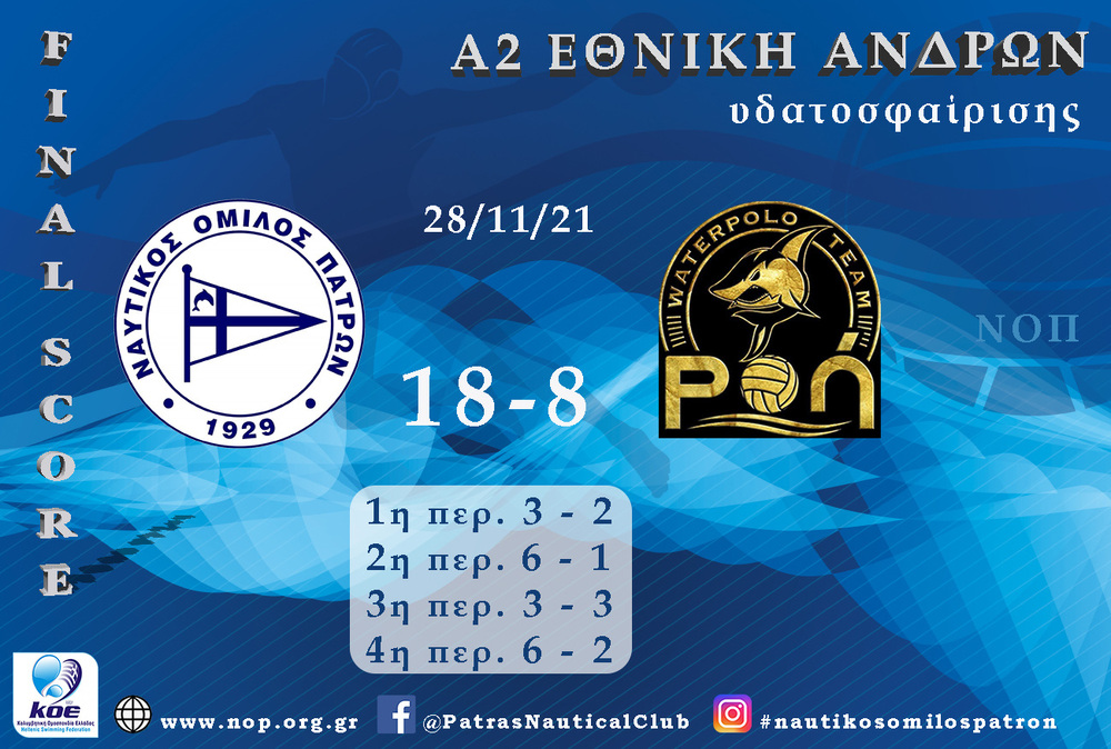 Με νίκη συνέχισε η ανδρική ομάδα του ΝΟΠ απέναντι στην ομάδα της ΣΚ ΡΟΗ με σκορ 18-08. Ηταν η εβδομη και τελευταία αγωνιστική του πρώτου γύρου για το πρωτάθλημα της Α2 ανδρών και ο ΝΟΠ με 7/7 τερματίζει στην κορυφή του Ομίλου και αήττητος.