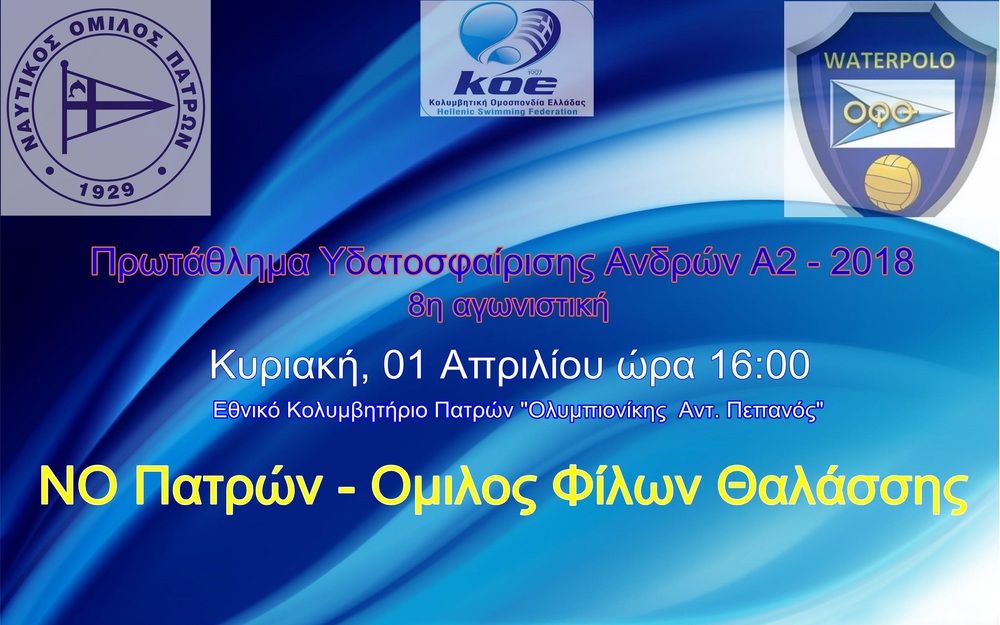 Την ομάδα του Ομίλου Φίλων Θαλάσσης της Θεσσαλονίκης αντιμετωπίζει ο ΝΟΠ, σε έναν αγώνα για την όγδοη αγωνιστική του πρωταθλήματος της Α2. Ο αγώνας θα διεξαχθεί την Κυριακή (01/04) στις 16:00, στο Εθνικό Κολυμβητήριο Πατρών «Ολυμπιονίκης .Αντ.Πεπανός». Ο ΟΦΘ είναι η μοναδική ομάδα από την οποία έχει ηττηθεί ο ΝΟΠ στην πρώτη αγωνιστική του πρωταθλήματος.