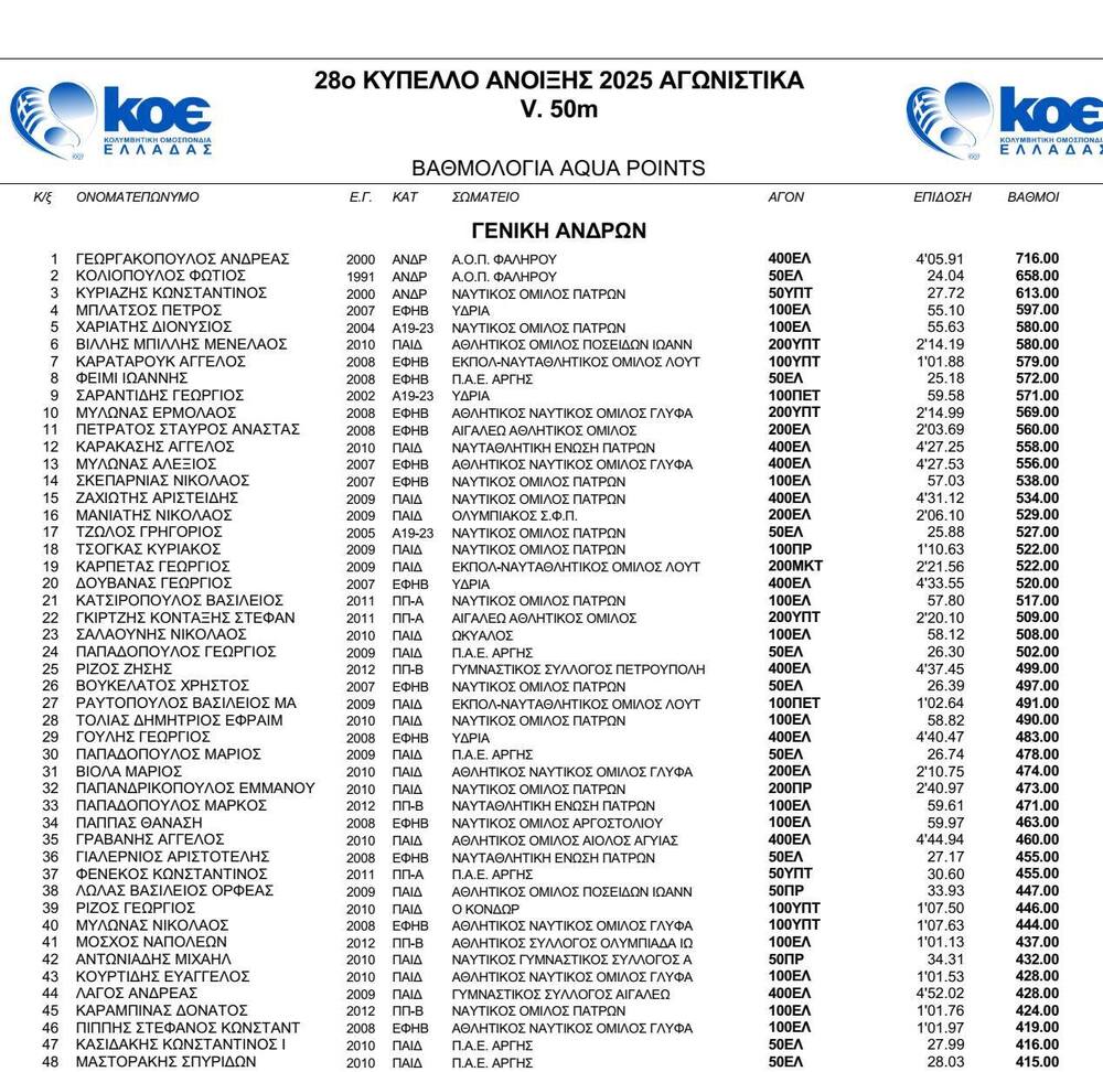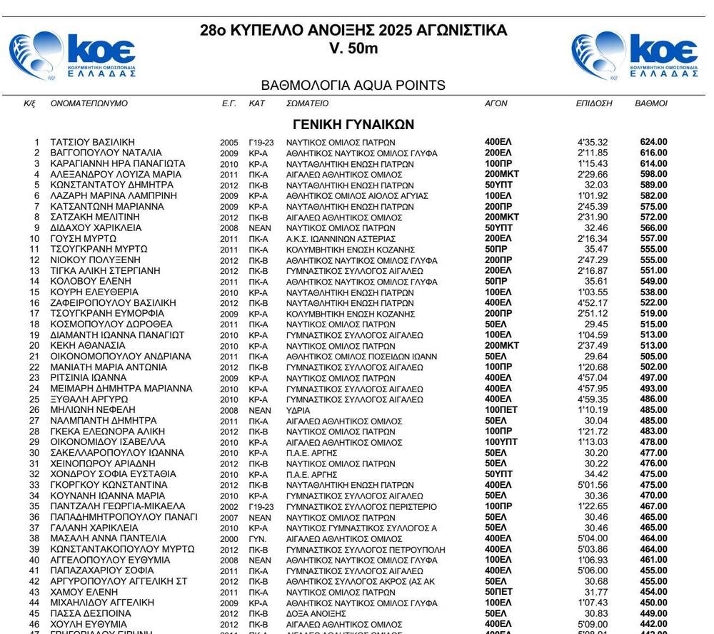 Με βάση το σύστημα βαθμολόγησης της ΚΟΕ (Aqua Points) η Βασιλική Τάτσιου ανακηρύχθηκε η καλύτερη κολυμβήτρια του 28ου Κυπέλλου Άνοιξης, αφού συγκέντρωσε 624 βαθμούς για την επίδοσή της στα 400 μέτρα ελεύθερο γυναικών με χρόνο 4:35.32.